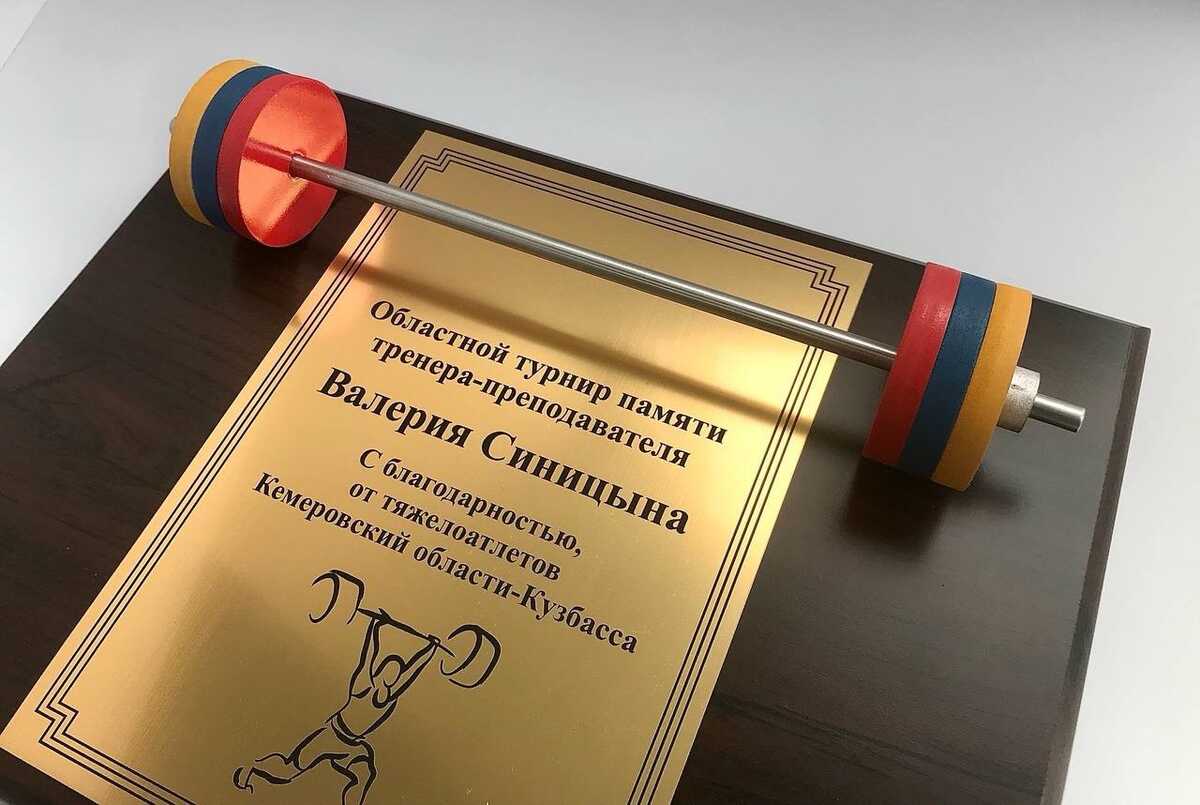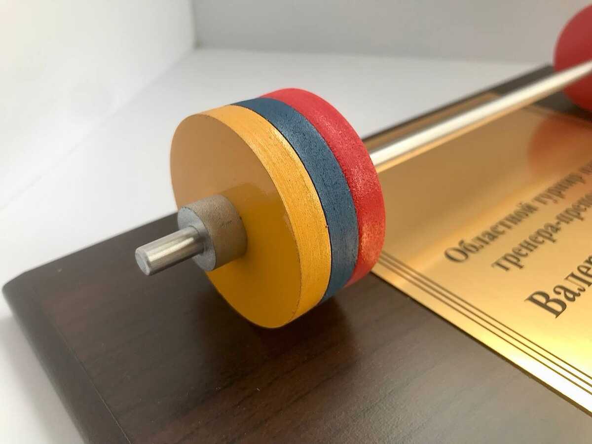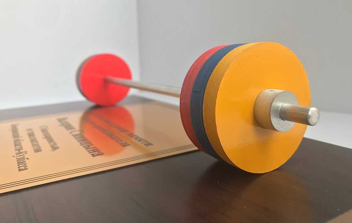 Центральным элементом композиции является стилизованный макет штанги, олицетворяющий силу и спортивный дух.